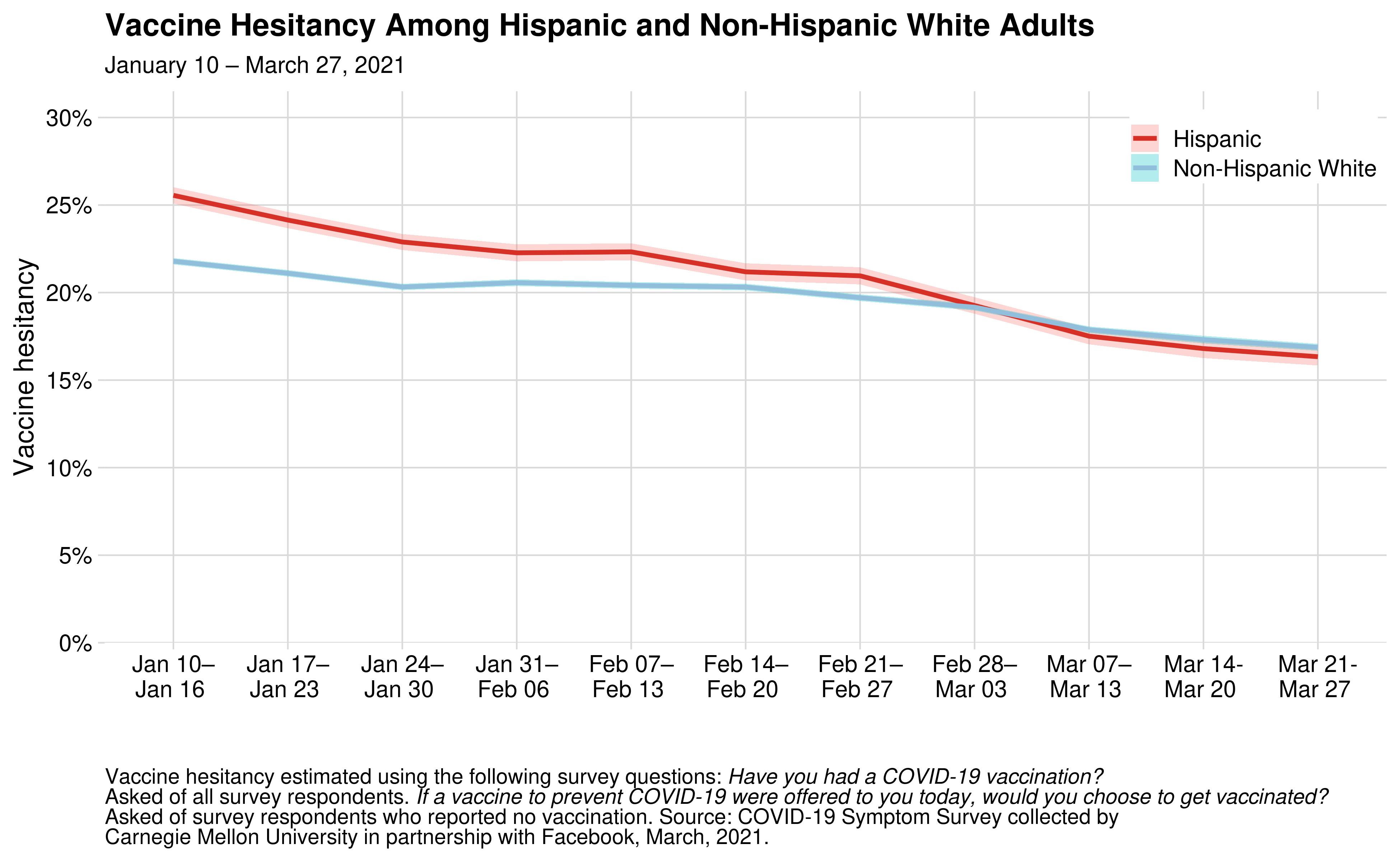 Since December 2020, the COVID-19 Symptom Survey conducted by the Delphi Group at Carnegie Mellon University and Facebook has included questions about COVID-19 vaccination behaviors and attitudes. Using de-identified aggregate data including 2.8 million responses collected between January 10 and March 31, 2021, now available publicly, we examined vaccine hesitancy and obstacles to vaccination for Hispanic adults across the United States, and how their experiences differ from non-Hispanic adults.